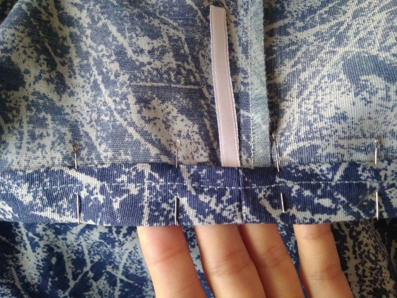 Затем сгибаем пояс пополам, скалывая (приметывая) булавками так, чтобы пояс перекрывал шов притачивания.
