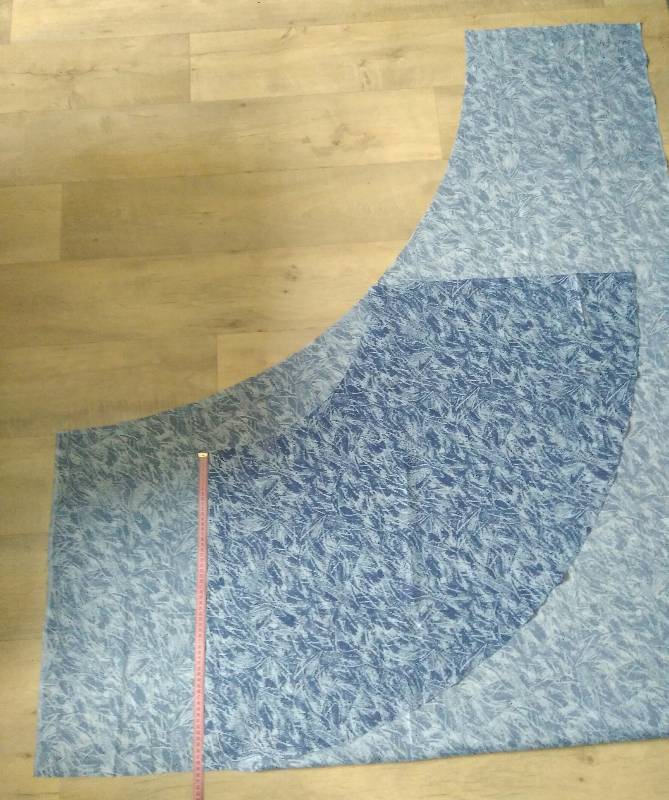Делаем чертеж на изнаночной стороне ткани кусочком мыла. Угол ткани будет отправной точкой нашего чертежа. От этой точки отмечаем найденное число R, например 37, и по принципу циркуля откладываем полуокружность, намечая линию талии на юбке.