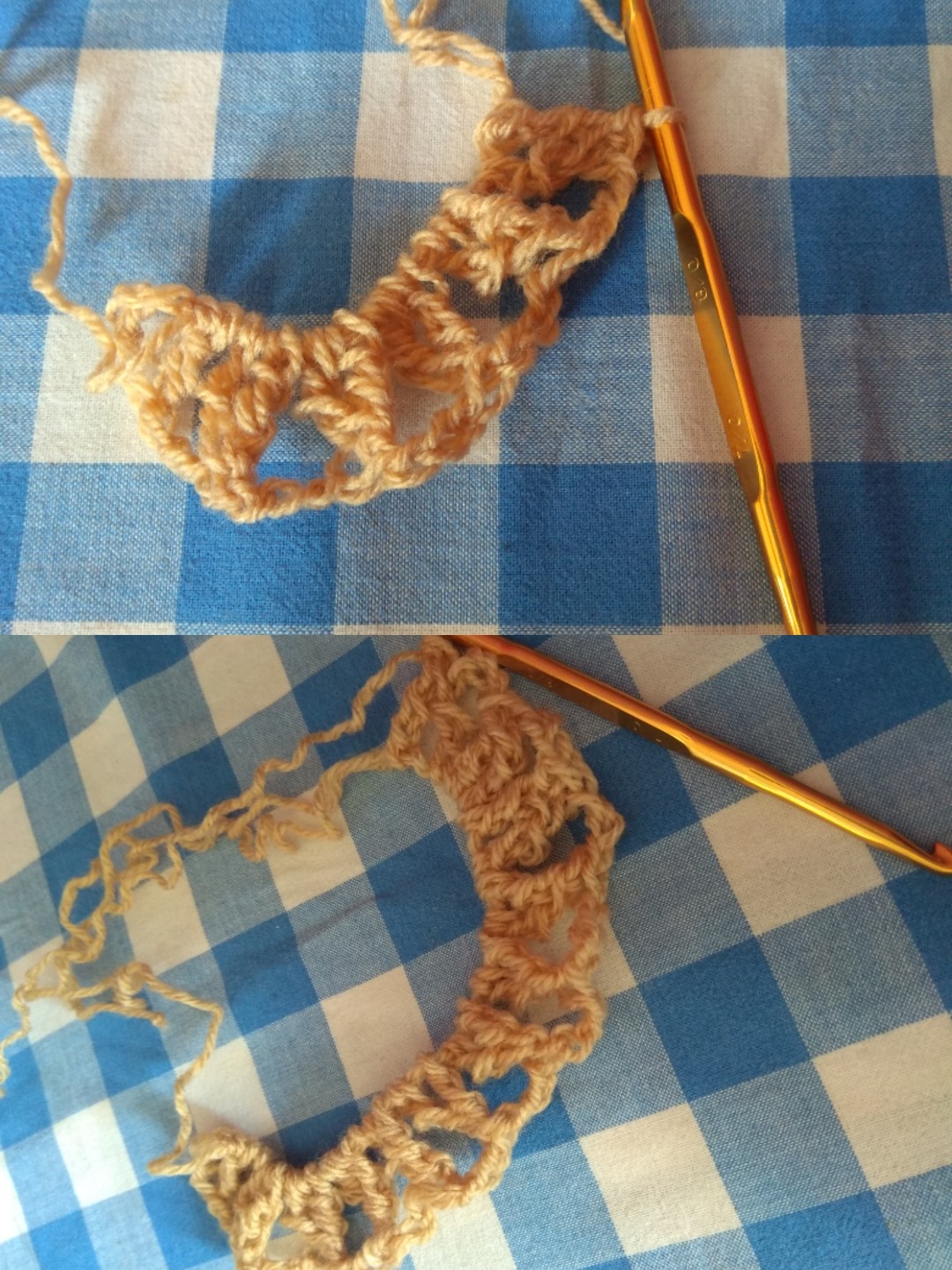 Вершины провязанных попарно столбиков с двумя накидами соединяют цепочки из 3-х воздушных петель.