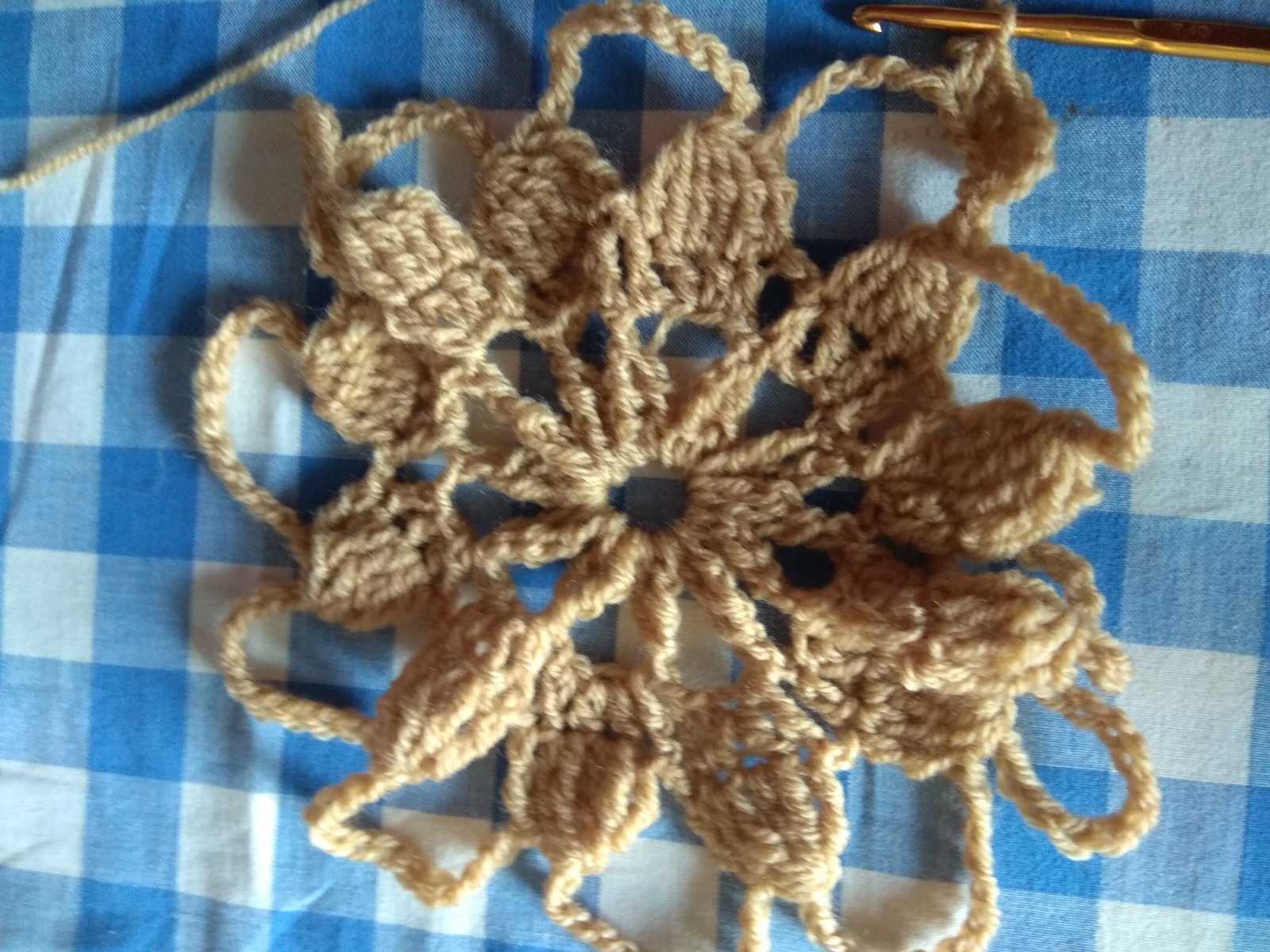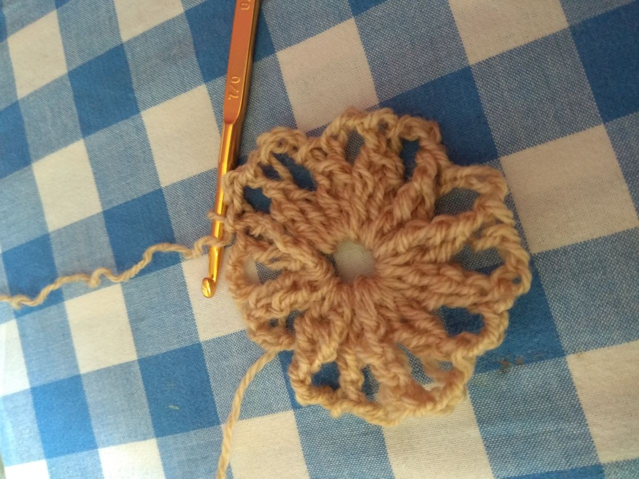 Со следующего ряда схема нам говорит делать подъем из 4 воздушных петель. И далее продолжаем провязывать столбики с двумя накидами в вершины столбиков с одним накидом. Между ними делаем цепочку из 13 петель.