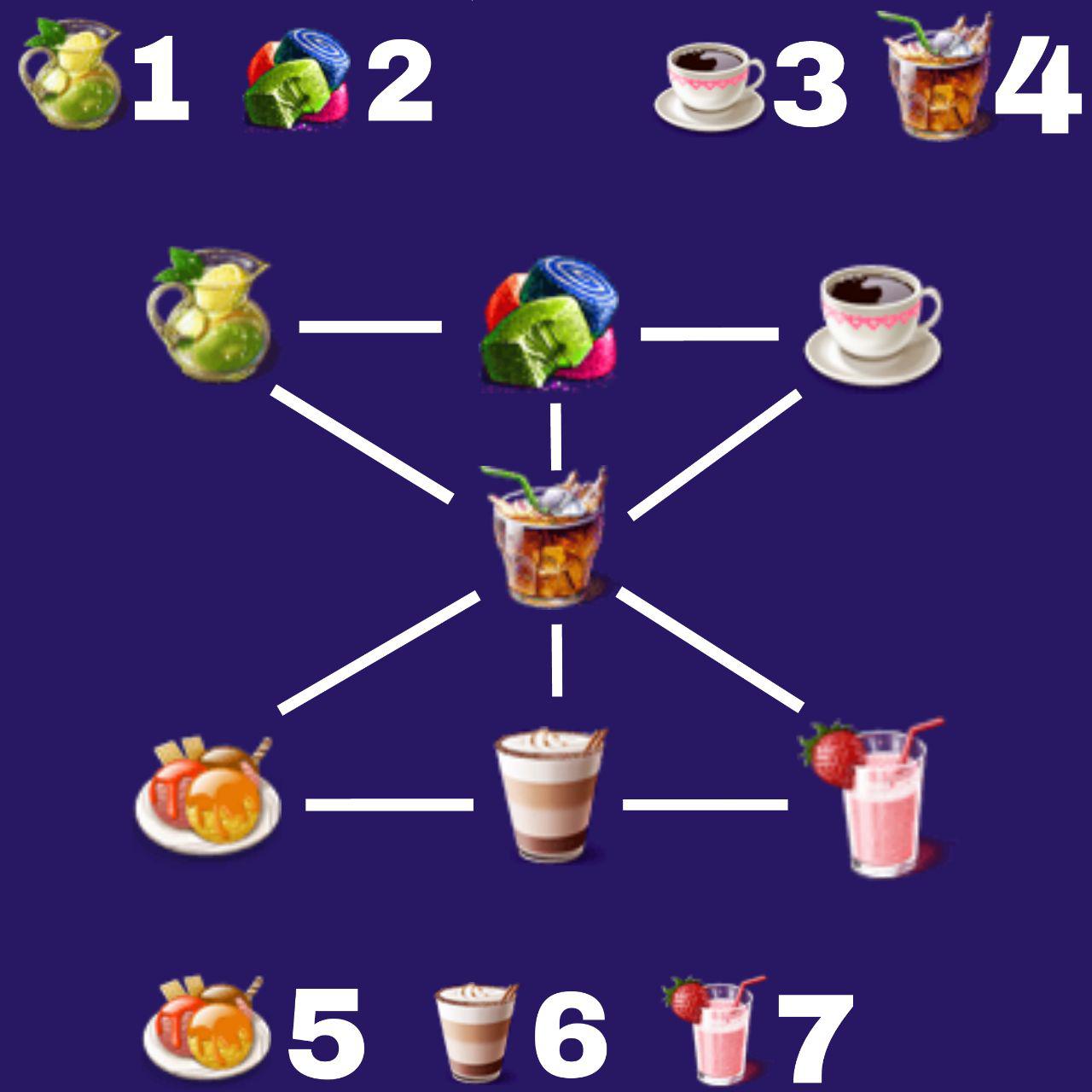 Цель игры : расставить лакомства таким образом, чтобы сумма чисел проставленных на лакомствах во всех указанных рядах составляла 12.Другими словами, в верхнем ряду(лимонад, мармелад и эспрессо) сумма лакомств должна составлять 12, в нижнем ряду(мороженое, латте, милшейк), центре(мармелад, энергетик, латте) и по диагоналях(эспрессо, энергетик, мороженое ; лимонад, энергетик, милкшейк) идентично.