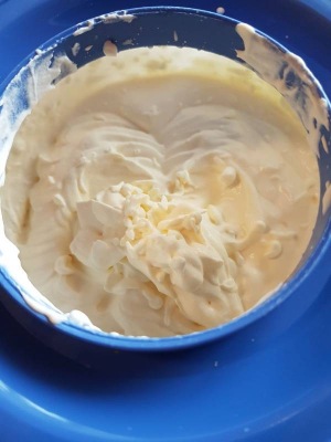Получившуюся массу смешать со сливками и осторожно, но очень тщательно перемешать.