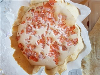 Выкладываем филе на тесто. Солим по вкусу. Заливаем начинку 300 мл жирных сливок.