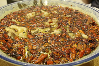 3. И буквально в последний день нашего пребывания в Китае, это было в Пекине, заключительным, финальным, фанфарным и ярким аккордом прозвучал карп в растительном масле с перцем чили. После длительной прогулки по центру города, голодные и уставшие, мы проходили, точнее даже уже проползали, мимо ресторанчика, в котором сидели только местные жители, все вывески были только на китайском и, конечно же, мы пошли туда. По-английски в нем также никто не разговаривал, но как уже было упомянуто выше, меню в Поднебесной удобные, и мы заказали ЕГО. Куски свежего карпа были положены в большое керамическое блюдо, залиты разогретым растительным маслом (скорее всего это было кукурузное масло) и ОЧЕНЬ обильно засыпаны перцем чили. Через несколько минут официант выловил все перцы чили из блюда и перед нами предстала восхитительная рыба, которая очень популярна в Китае, но совершенно в новом обличье. Не смотря на то, что для приготовления данного блюда используется много масла, рыба в нем не жарится, как во фритюре. Она не успевает вобрать его в себя, остается мягкой и свежей, но при этом впитывает в себя аромат и остроту перчиков чили.