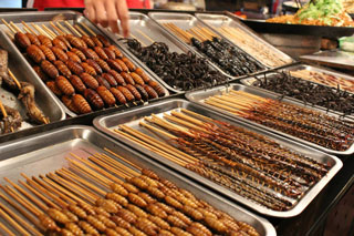 1. По праву считается, что китайцы едят буквально все, что бегает, летает, ползает, плавает и т.д. Мне было очень интересно, как далеко я смогу зайти в данном вопросе. Хочу сказать, что, по меркам Китая, я вообще никуда не зашла. Если вы находитесь в Пекине, то самым удобным способом проведения такого эксперимента над собой является рынок Wangfujing (Ванфуджин), рядом с одноименной станцией метро на одной из пешеходных улиц Пекина. Он открывается около 18:00 часов и активно работает примерно до 23:00. Это 100% туристическое место, но с очень приятной и располагающей атмосферой. Здесь вы найдете еду на любой вкус: различные виды лапши, супов и риса, фрукты и овощи, соки, сладости, колбаски, морепродукты и, конечно же, экзотику. Под экзотикой я понимаю насекомых. Скорпионы и пауки на шпажках, жареные кузнечики и сверчки, личинки, различные многоножки и безножки, названия которых я не знаю. Моим потолком оказались жареные личинки шелкопряда на шпажках, такой вот шашлык «мечта энтомолога». По вкусу они очень напоминали раков, т.к. их мясо также содержит очень много белка, и оно похоже на раковое мясо по структуре. Скорее всего, есть еще какое-то научное объяснение этому, но я его не знаю.