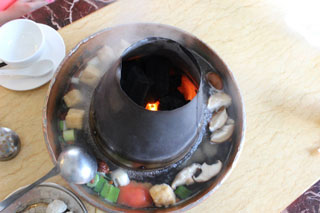 2. Моим вторым ярким впечатлением был Хот пот (Hot pot) – в дословном переводе «горячий горшок». Гуляя с другом по раскаленным шанхайским улицам, мы наткнулись на ничем не примечательное кафе для местных, рядом с которым стояли странные посудины. Это и были те самые «горячие горшки». В колбу в середине засыпают раскаленные угли, в миску наливают горячую воду и высыпают смесь из зелени, грибов и приправ. Гости выбирают по меню продукты (ингредиенты), которые они потом сами опускают в кипящую воду. Почти во всех китайских кафе и ресторанах меню дублируется на английском, или как минимум, рядом с названием блюда на китайском будет картинка. Проблем с заказом у нас не возникло, хотя никто из персонала не разговаривал по-английски. Мое удивление в отношении этого блюда заключалось в том, что я была уверена, что в Китае, не считая супов, абсолютно все жарят, и для всего используют приправы и масло. Хотя если посмотреть в целом, то китайская кухня очень здоровая, процесс обжарки занимает очень мало времени, и в готовке используется много свежих полезных овощей, специй и приправ, а также нежирных продуктов животного происхождения. Но здесь у нас получилось исключительно диетическое блюдо, плюс сам процесс закладывания продуктов в хот пот и доставания их обратно оказался крайне занимательным и забавным.