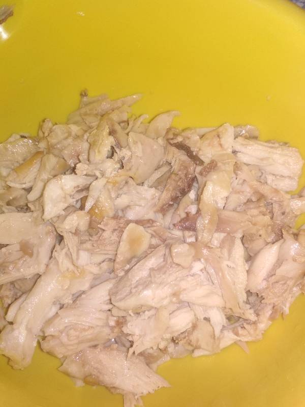 Для начала отварим мясо птицы, остудим, разберём или нарежем на кусочки.