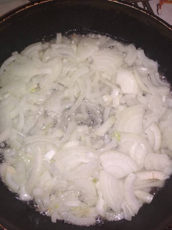 Теперь нарезаем полукольцами репчатый лук и отправляем его на разогретую сковородку.