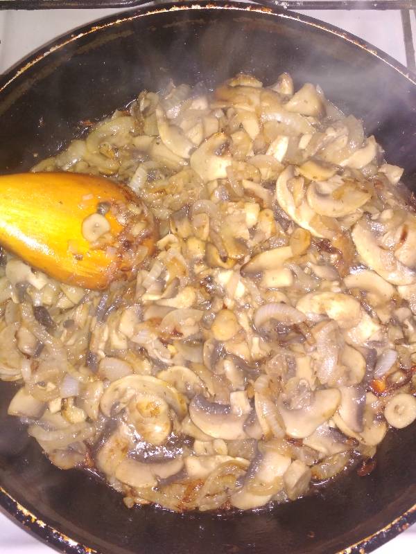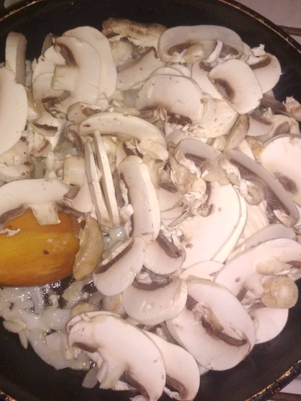 Пока обжаривается до прозрачности лучок, нарезаем пластинками шампиньоны и отправляем их к луку, солим, немножко перчим, я использую белый перец