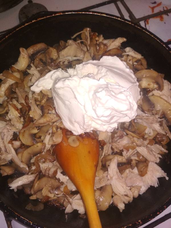 Соединяем мясо, жареные грибочки и сметану, хорошенечко перемешиваем. Я буду запекать жюльен прямо в сковороде, поэтому перемешиваю в ней же. Обычно это делают в порционных кокотницах, но у меня упрощённый домашний вариант