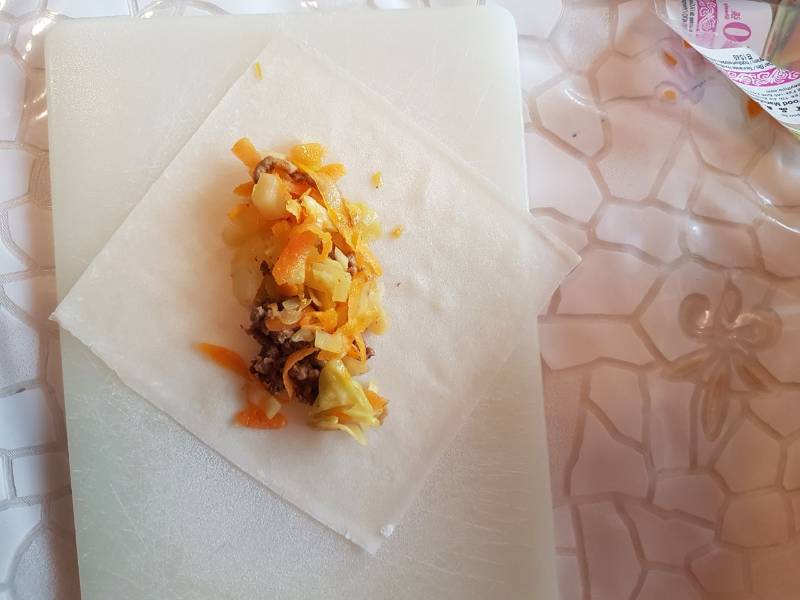 Осторожно отделяем один лист рисовой бумаги (они очень тонкие ) и кладём на доску углом к себе. Сверху выкладывем немного начинки и начинаем заворачивать от угла к углу как на фото.