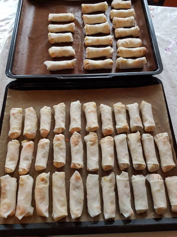 Кладём рулетики на пекарскую бумагу на противень и запекаем в духовке примерно 10-15 минут при температуре 200 градусов. До золотистого цвета.