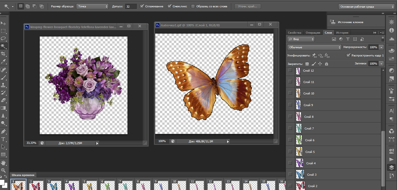 Теперь открываем файл с гиф анимацией. У меня это бабочка. Так же потянем мышкой файл,чтобы поместить окно рядом с предыдущим.