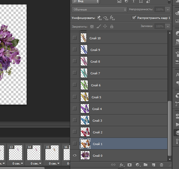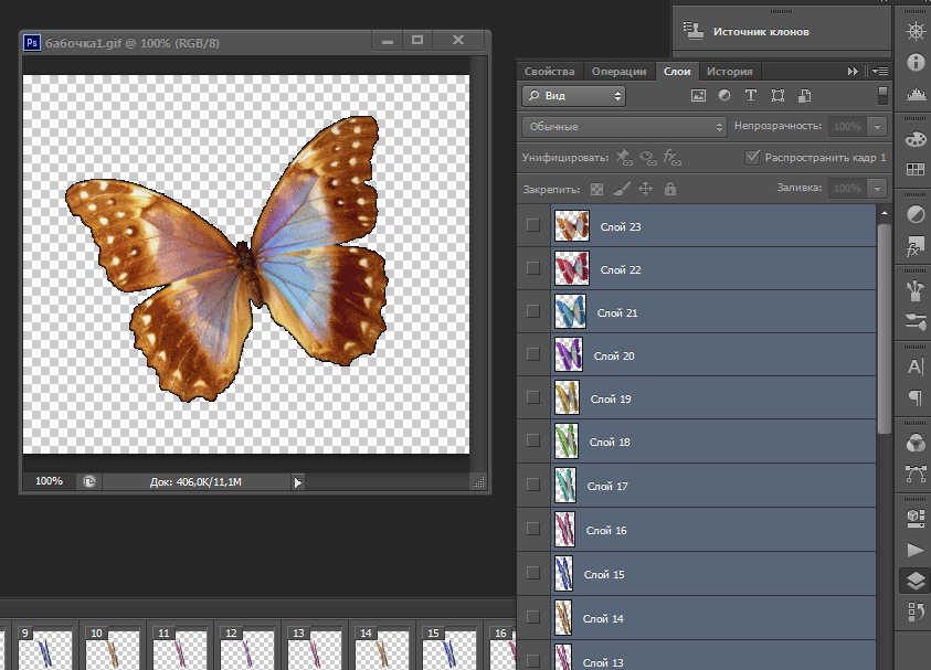 Теперь каждому слою анимации соответствует кадр. Чтобы наша бабочка начала махать крылышками на букете, осталось совсем немного. Возвращаемся в панель слоёв