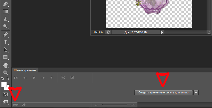 Теперь нам необходимо создать временную шкалу для видео, на нижней панели инструментов есть такая кнопка. И сразу же в нижнем левом уголке нажимаем на три квадратика, таким образом видео превращаем в анимацию.