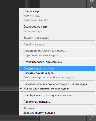 Теперь здесь же, в нижней панели Шкалы времени, в правом углу кликаем на треугольничек, открывается перечень команд. Выбираем - Создать кадры из слоёв.