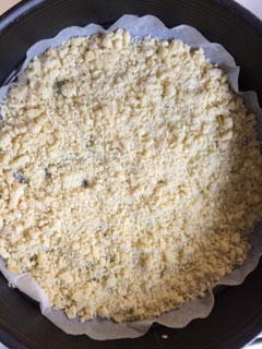 На подготовленную форму для выпечки половину теста выложить руками в виде крошек, просто растереть между ладонями и равномерно рассыпать по форме. Сверху выложить творожную начинку.
