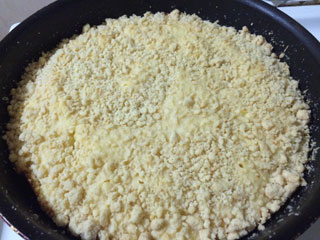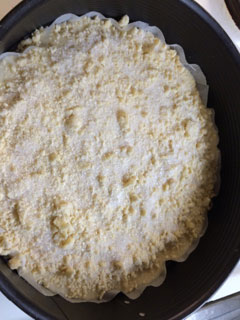 Сверху на начинку так же рассыпать вторую половину теста, равномерно закрыв творог. Сверху немного посыпать сахаром.