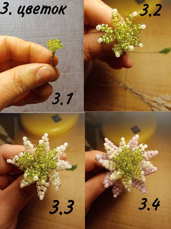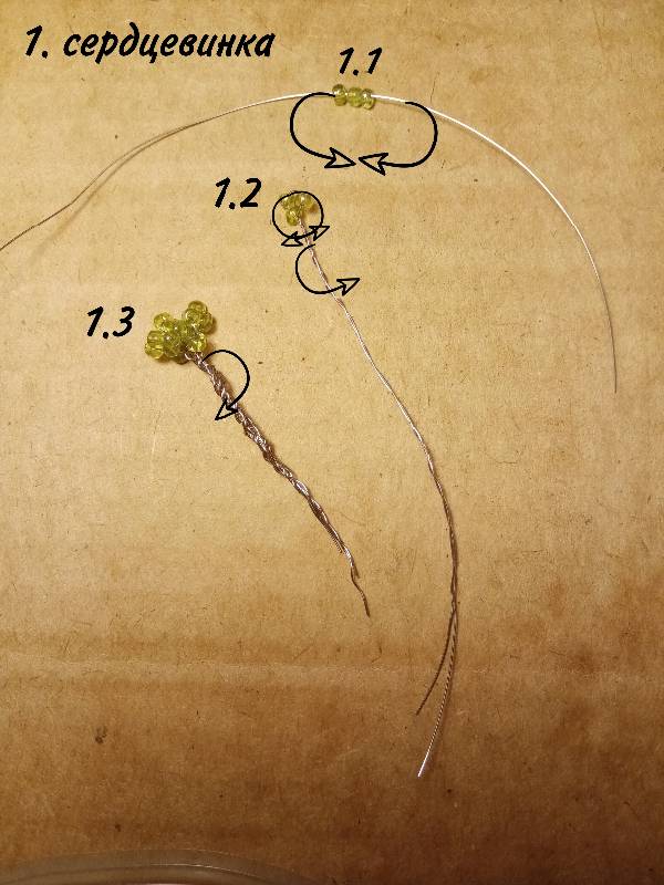 Для лепестка или листика продеваем проволоку в одну бусину, потом крест на крест - ещё в две. Потом, так же крест на крест в три.