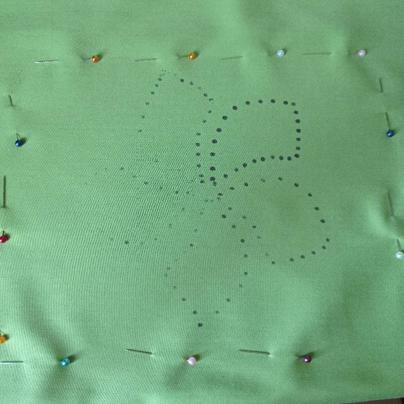 Теперь перенесём этот рисунок на основную ткань, например, с помощью копировального колёсика или карандаша. Или же выполнить рисунок на тонкой бумаге - кальке или даже пекарской бумаге и приколоть к ткани, а следующий этап выполнять прямо поверх бумаги.
