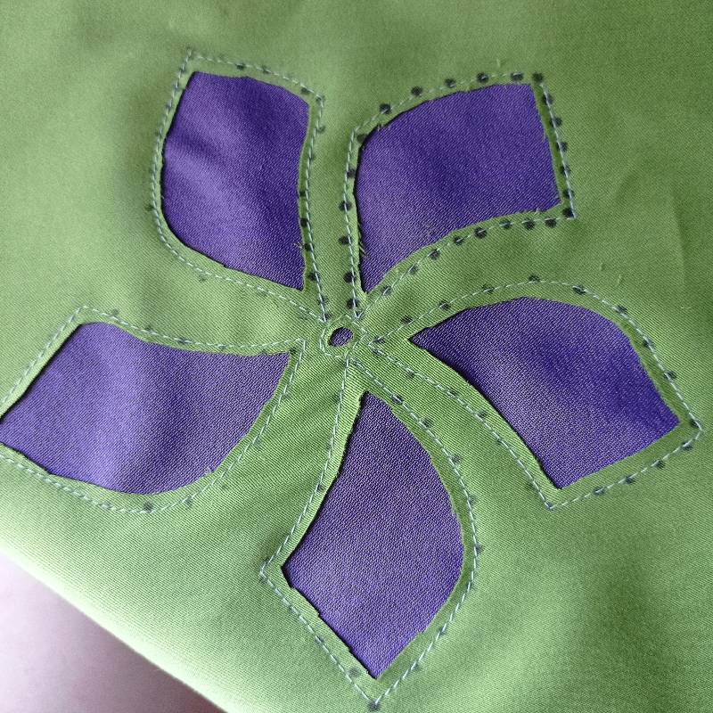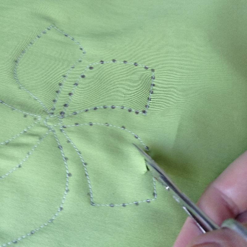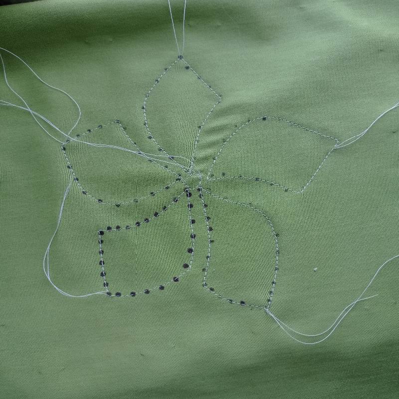Следующий этап - нужно проложить машинную строчку контрастными нитками или в цвет основной ткани по контуру рисунка. Можно сделать это и вручную мелкими стежками швом вперед иголкой.