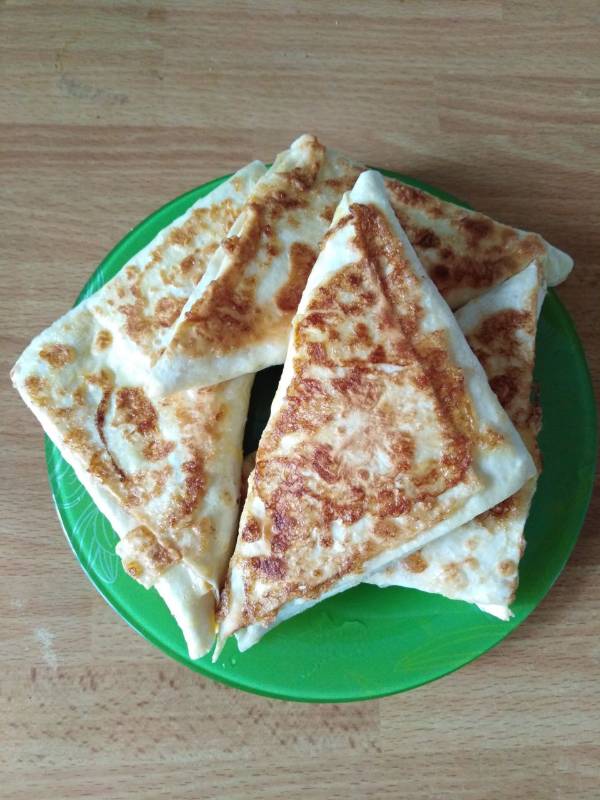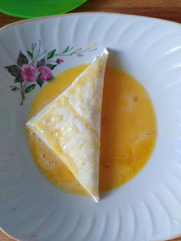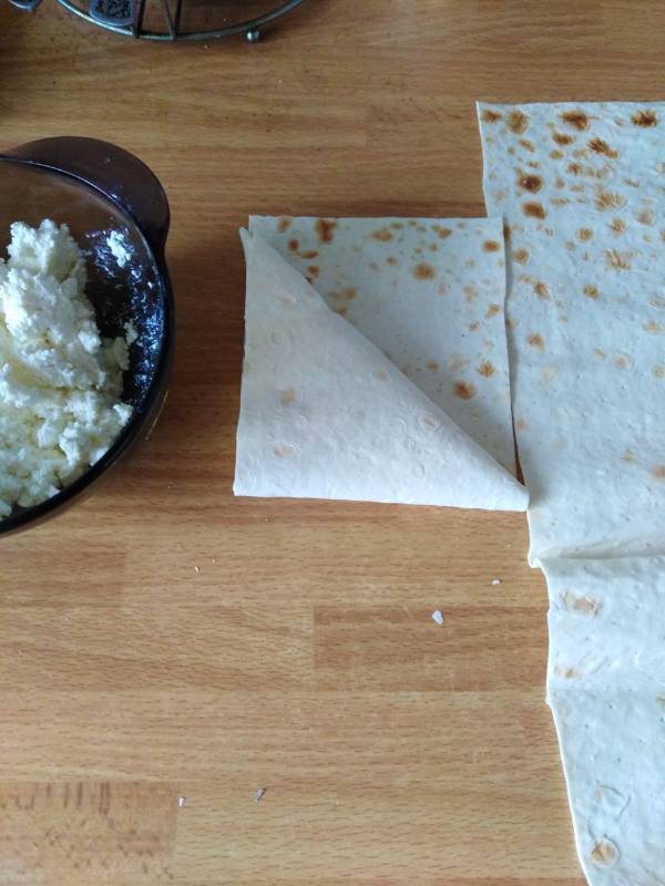 Выкладываем любую начинку, у меня творог+ сахар по вкусу, сворачиваем как на фото.