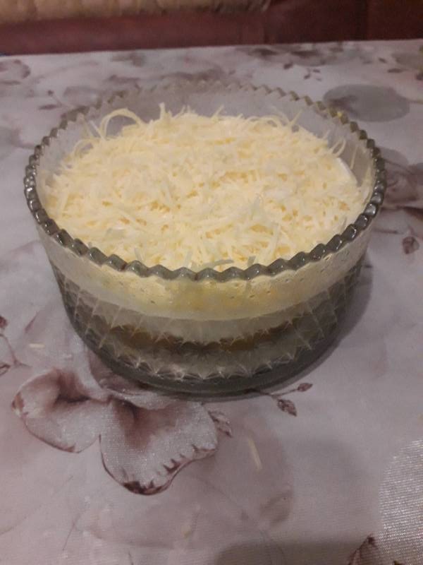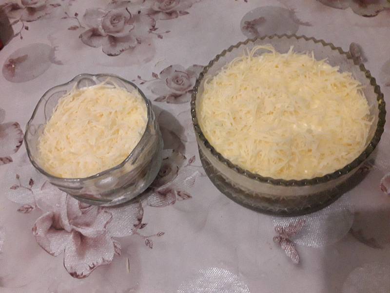 4 слой - яйцо тертое на крупной терке, солим и смазываем майонезом тонким слоем.