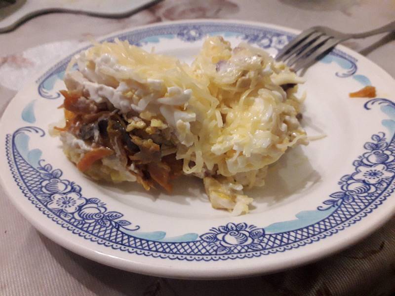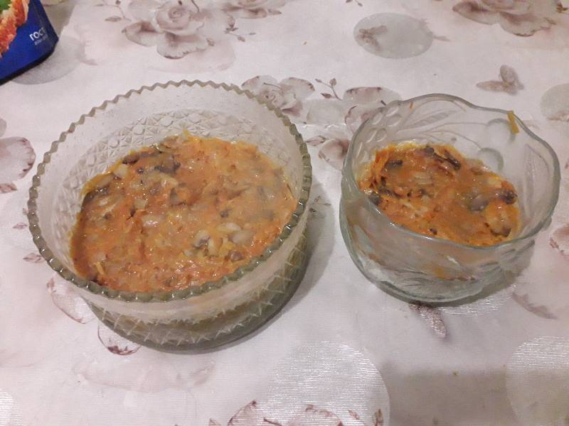 2 слой - смесь из грибов и пережарки. Этот слой майонезом НЕ мажем.