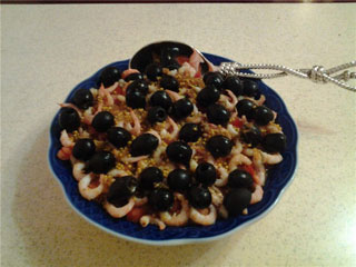Крупные маслины с косточкой и для красоты отварные креветки.