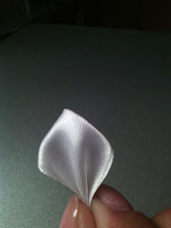 Для начала нарезаем нашу ленту шириной 2,5см на отрезки по 6 см (нам их потребуется 21шт) и складываем их уголком.