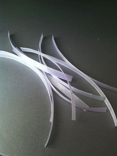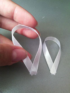 Теперь делаем лепестки-петельки. Для этого нарезаем ленту шириной 0,5 см на отрезки по 12 см, нам потребуется их 14 штук.