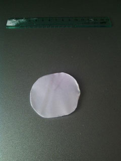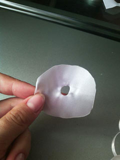 И теперь, чтобы не было видно эти полоски и для дополнительной крепости, вырезала из ленты шириной 5 см круг, края оплавила над свечкой и сделала в центре отверстие, которое тоже оплавила. В это отверстие продеть резинку и приклеить к основе.