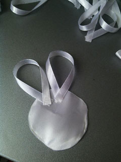 Так как белой резинки у меня не нашлось, я приклеила его на бежевую. Прикрепила резинку с помощью ленты шириной 0,5 см крест-накрест.
