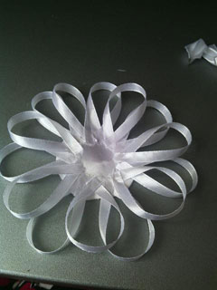 Начинаем сборку нашего цветка! Сначала при помощи клеевого пистолета приклеиваем 7 лепестков-петелек, не очень плотно. Потом приклеиваем ещё 7 петелек в промежутки первого ряда. Получилась ромашка.
