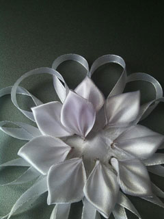 В этом мастер-классе цветок канзаши сделан из двух видов лепестков: плоский острый и лепесток-петелька. Для создания такого цветка понадобится: