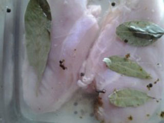 Далее в ёмкость выкладываем куски филе с добавлением лавровых листьев и перца горошком. Заливаем рассолом. Вода должна полностью покрыть филе.