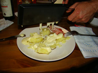 Название «Раклет» происходит от французского слова racler, что в переводе означает «скоблить, скрести». Это национальное швейцарское блюдо, которое готовится из расплавленного жирного сыра. Существует много швейцарских полутвердых сортов сыра, которые используются для приготовления раклета, иногда это сыры с добавление чеснока или других специй. Готовят такие сыры в основном из коровьего молока, но бывают сорта и из козьего, и очень часто они носят одноименное название «Раклет», они отличаются специфическим привкусом из-за того, что их обмывают белым вином, а не водой. Первые записи и упоминания о блюде были найдены в монастырских рукописях, повествующих о блюде из вкусного и питательного расплавленного сыра, которое готовили пастухи в Альпах. Как и много другое на нашей планете, все гениальное просто. Пастухи клали головки сыра к огню и соскребали плавящийся от жара костра сыр, который употребляли в пищу с теми продуктами, что у них были под рукой: хлеб, овощи, мясо. Для приготовления современного раклета используются маленькие настольные печки – раклетницы (электрические или с горелками), на которых кусочки сыра растапливаются и потом очень удобно соскребаются на тарелки, сервированные уже картофелем, сваренным в мундире, мясным ассорти (различные виды ветчины), маринованными огурцами или мостардой, соусом из маринованных в горчице и сиропе фруктов, специальным раклетным ножом (лопаточкой).