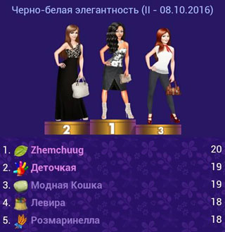 Zhemchuug: В основном стараюсь подбирать наряд по теме, конечно, всегда хочется попасть в 10-ку победительниц на подиуме, а когда первое место, радости нет предела :D :dance Это не первый раз, но хочется почаще :) тем более, сейчас еще и награды монетные, а это вдвойне приятней :[