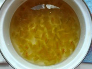 Помещаем корки в сироп, доводим до кипения, кипятим в течение 5 минут и отставляем остывать на 12 часов.