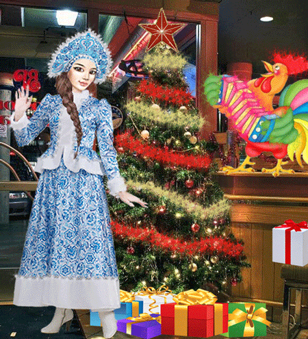 Начну с новогодней елки, сразу скажу, что пользовалась программой Adobe Photoshop. Я сделала фоновую картинку (наложила елку, петуха и новогодние игрушки и соединила слои между собой), думаю, этот этап все делали с легкостью