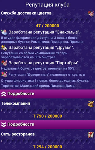 Итак, вы открыли клуб, купили Студию флористики. Где же посмотреть перечень всех репутаций? Для этого идём в раздел Клуб и выбираем Репутация . Там вы увидите значки ступеней репутаций. Чтобы прочитать описание каждой ступени жмём на Подробности