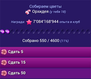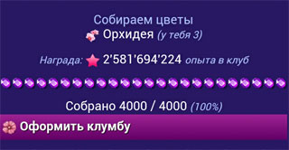 Когда собрано полное количество цветов, Владелица оформляет клумбу и в этот момент награда Клубный опыт добавляется в клуб.