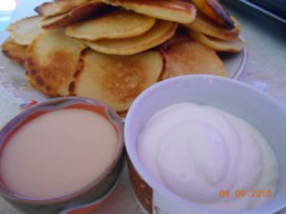 Оладьи готовы. Подаём со сметаной и сгущенкой. Или с чем любите