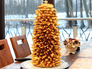 Второе по известности блюдо литовской национальной кухни необычной формы – торт шакотис (лит. šakotis), что в переводе с литовского означает «ветвистый». Хотя в Литве шакотис называют тортом, на мой взгляд, сказать однозначно, к какому виду десертов (к тортам, пирогам, печенью, кексам или к какому другому) относится данное блюдо, достаточно тяжело. Этот десерт готовится из жидкого теста, для которого на 1 килограмм муки берется от 30 до 50 яиц. Его выпекают на открытом огне на деревянном или металлическом вертеле, на который по мере готовности поливают новые порции яичной массы. Стекая по крутящейся основе, запекаясь, тесто приобретает форму многочисленных сучков, придавая шакотису форму дерева с множеством веток или ёлки.