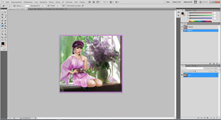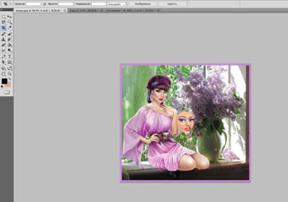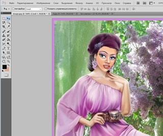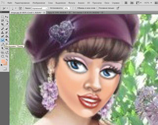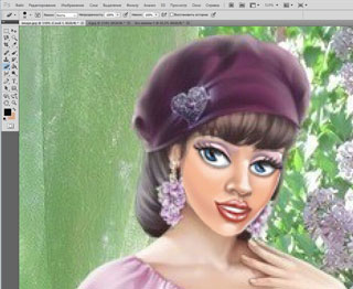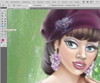 Включаем видимость нижнего слоя с картинкой. ЛАСТИКОМ же, аккуратно, за несколько раз вытираем место на лице Модницы, где на нижнем слое расположена челка.