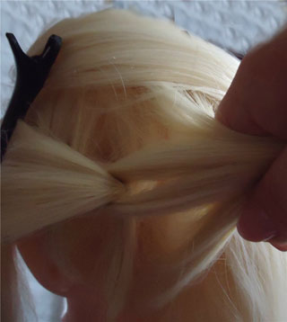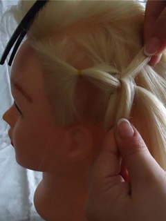 Отделяем вторую прядку, и так же фиксируем резиночкой. Затем берем 1-й хвостик и делим его пополам, 2-й хвостик проходит между двумя прядками 1-го хвостика. 2-й хвостик фиксируем зажимом.