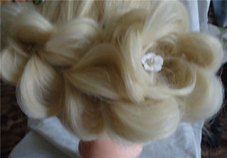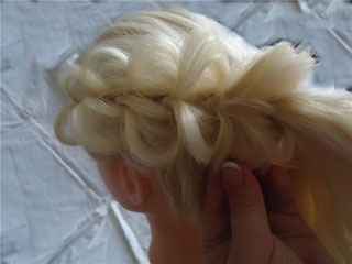 А сейчас я вам покажу, как можно сделать праздничную прическу. Для этого мы хвостик заворачиваем колечком и укладываем сбоку возле уха. Фиксируем все невидимками в середине и по краям. На фото видно – получается похоже на цветок. Фиксируем лаком для волос.