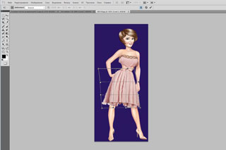 Мы видим, что вокруг юбочки появился пунктирный квадратик, разбитый на части. Подцепляя мышкой точки в углах маленьких квадратиков, слегка тянем их так, чтобы центр юбочки оказался ровно напротив центра лифа, а ее верх плавно лег на бедра Модняши.