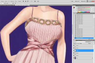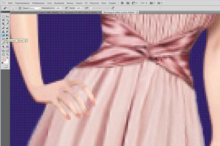 Повторяем все проделанное для пояса и для тесемок на плечах (тесемки можно и просто подрисовать - только используйте при этом несколько цветов, близких по тону). А затем увеличиваем размер картинки до пикселей (крутим колесико мышки, одновременно зажимая кнопку Alt на клавиатуре) и аккуратно подчищаем ЛАСТИКОМ (не забывая переходить со слоя на слой) все лишнее и торчащее на нашем платье. И, если есть необходимость, подрисовываем недостающее. Как это делать, мы разбирали с вами в предыдущих уроках.