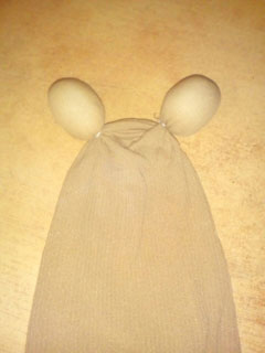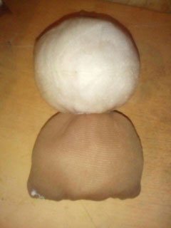 Скатываем из наполнителя небольшой шарик и засовываем его в уголок носка,сжимаем и обматываем нитками белого цвета.